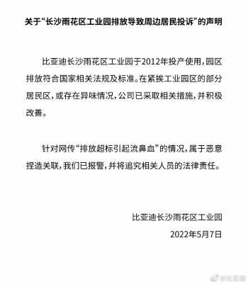 7日晚间,比亚迪发布官方声明表示已经报警处理。比亚迪在声明中称:比亚迪长沙雨花区工业园于2012年投产使用,园区排放符合国家相关法规及标准。在紧挨工业园区的部分居民区,或存在异味情况,公司已采取相关措施,并积极改善。针对网传“排放超标引起流鼻血”的情况,属于恶意捏造关联,我们已报警,并将追究相关人员的法律责任。