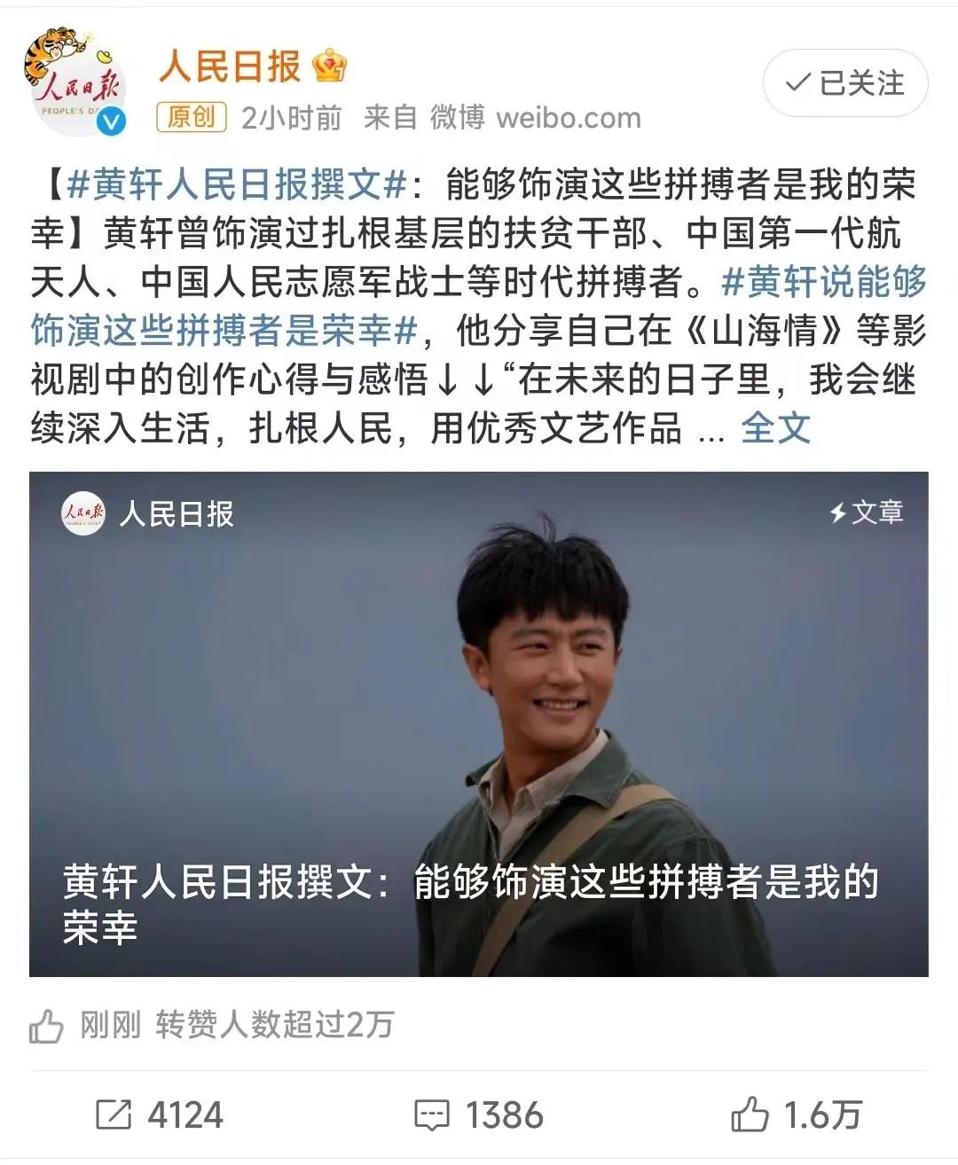 不经意间,“明星人民日报撰文”渐成热门现象,引发关注和热议。上周,刘烨、王凯接连在人民日报上刊发文章。今天,黄轩的文章在人民日报见报。无论二度撰文的王凯,还是黄轩,都冲上了微博热搜。