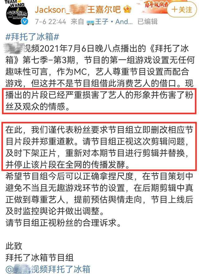 但节目组不应该剪辑进去,审片人员也不该通过。或许工作人员放进正片是想搞笑,可网友们却觉得一点都不好笑。连普通吃瓜群众都感到无语,可想而知王嘉尔的粉丝会有多生气。粉丝后援会发文表示,播出片段已经严重损害艺人形象,伤害了粉丝和观众的情感,要求节目组立即删改并郑重道歉,将正片即时下架剪辑,停止该片段全网传播发酵。