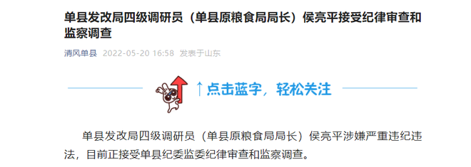 据清风单县5月20日消息,单县发改局四级调研员(单县原粮食局局长)侯亮平涉嫌严重违纪违法,目前正接受单县纪委监委纪律审查和监察调查。