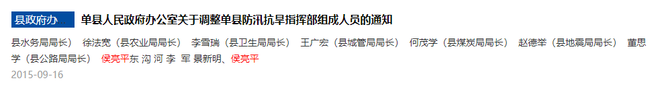 2019年6月,单县政府官网发布的一则任免通知显示,侯亮平任单县发展和改革局主任科员,原任单县粮食局局长职务自然免除。
