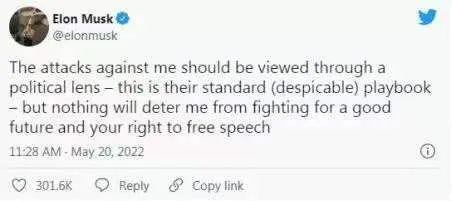 路透社称,马斯克最初在推特上回应,指责这是对他的政治攻击,意在干扰他对推特的收购。“这些疯狂的指控完全是不真实的”。马斯克说:“应该从政治角度看待对我的攻击——这是他们标准的(卑鄙)剧本——但没有什么能阻止我为美好的未来和你们言论自由的权利而奋斗。”不过,他没有提及“商业内幕”报道中的指控。马斯克还给这则“丑闻”起了个名字——埃隆门(Elongate)。