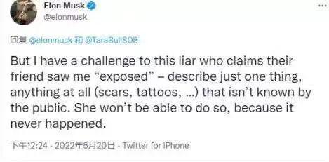 而在下午发布的另一条推特中,他向爆料的空姐发出挑战,他在一条推文中写道:“我要向这位声称他们的朋友(涉事空姐)看到我‘暴露’的骗子提出挑战——只需要描述一件事,任何公众不知道的事(伤疤、文身……)。她无法做到这一点,因为它(性骚扰)从来没有发生过。”