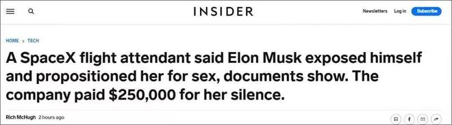 人红是非多,世界首富马斯克几乎每隔几天就要上一次热搜,而这一次是被一名空姐控告其性骚扰。美国“商业内幕”网站19日爆出特斯拉CEO埃隆·马斯克的“性丑闻”,称SpaceX公司公务机机队的一名空姐指控马斯克对她进行了包括暴露私处在内的性骚扰。