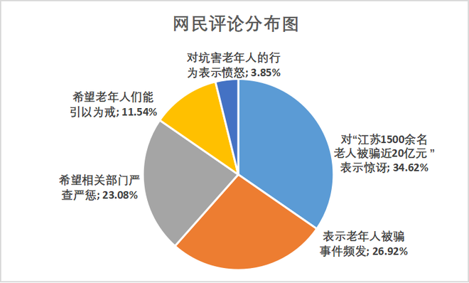 一是对“江苏1500余名老人被骗近20亿元 ”表示惊讶,占比34.62%,典型网友评论如下: