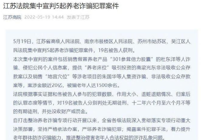 近日,江苏集中宣判5起养老诈骗案,19名被告人获刑。本次集中宣判案涉金额近20亿元,受害老人达1500余名。在当天宣判的案件中,不法分子将老年人群体锁定为推销产品的主要对象,寻找厂家专门定制了一批廉价录入式便携播放器——评书机,提前录入音频资料,夸大介绍根本不具有药品成分的食品保健类产品“301参茸倍力胶囊”,通过邮寄方式赠送给老年客户。不少老年人被评书机中高频出现的“301参茸倍力胶囊”广告吸引,甚至误认为是正规电台的官方广告,于是主动拨打热线咨询,就这样一步步落入几万元、几十万元的圈套。目前,该信息已在网络上引发广大网民热议。