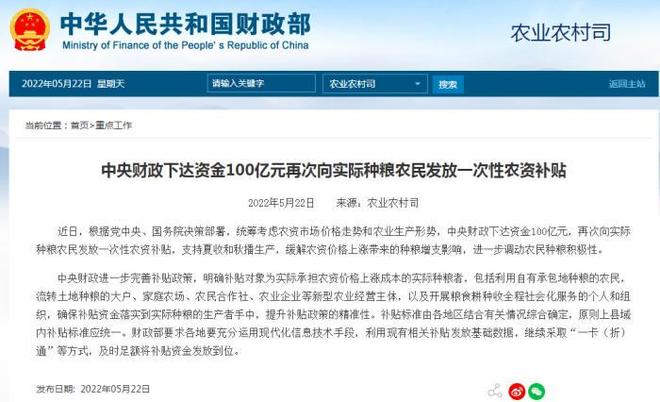 中新财经5月22日电 据财政部官网消息,近日,根据党中央、国务院决策部署,统筹考虑农资市场价格走势和农业生产形势,中央财政下达资金100亿元,再次向实际种粮农民发放一次性农资补贴,支持夏收和秋播生产,缓解农资价格上涨带来的种粮增支影响,进一步调动农民种粮积极性。(完)