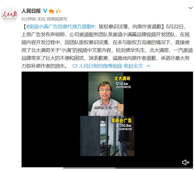 奥迪小满广告创意代理方道歉:版权意识淡薄,向原作者道歉