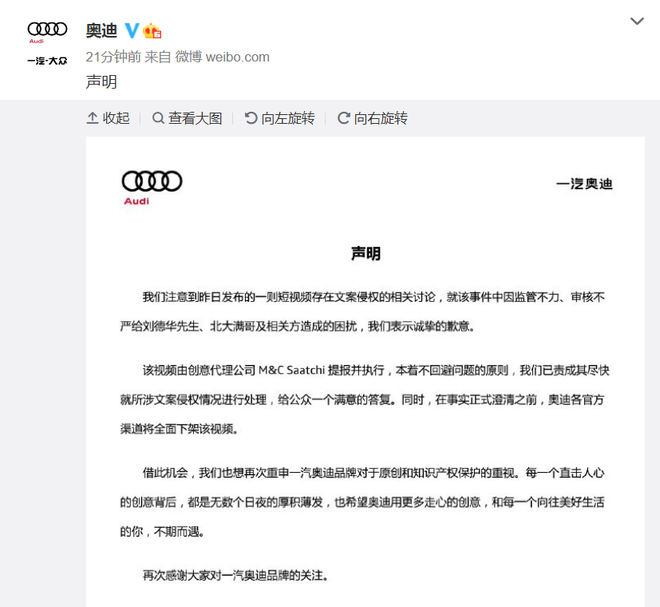 22日上午@奥迪 作出回应:就该事件中因监管不力、审核不严给刘德华先生、北大满哥及相关方造成的困扰,我们表示诚挚的歉意。奥迪同时表示,会给公众一个满意的答复。