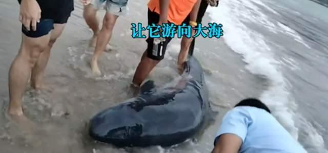 近日,广东深圳海滨浴场,一头3米长的抹香鲸在沙滩搁浅,市民看到抹香鲸搁浅,纷纷施以援助之手,不停地往抹香鲸的身上抹水。有的市民还会让市民散开,方便抹香鲸呼吸新鲜空气。