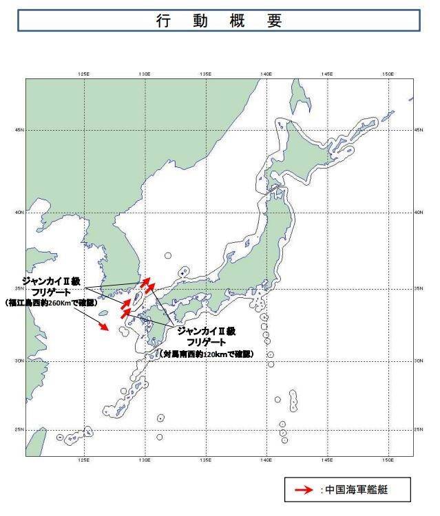 在第一份通告当中的内容显示,海自在22日下午1时许(北京时间午间12时)于九州长崎县福江岛以西约260千米处确认到1艘向东南航行的054A型导弹护卫舰,至23日早间7时许(北京时间早6时),又在对马岛西南方向约120千米确认到1艘054A型导弹护卫舰,随后确认到两舰向东北航行,穿越对马海峡从黄海进入日本海。