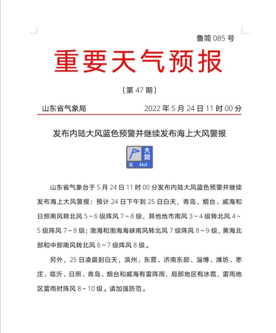 24日11时,山东省气象台发布内陆大风蓝色预警并继续发布海上大风警报:预计24日下午到25日白天,青岛、烟台、威海和日照南风转北风5~6级阵风7~8级,其他地市南风3~4级转北风4~5级阵风7~8级;渤海和渤海海峡南风转北风7级阵风8~9级,黄海北部和中部南风转北风6~7级阵风8级。