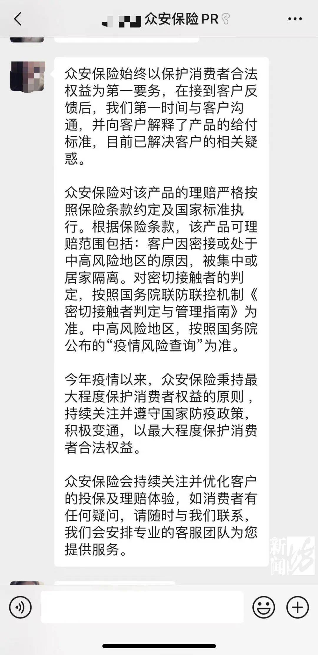 沈女士表示,当时小区有阳性,她也跟保险公司反馈,且上海发布、浦东发布都有相关信息,经过四五个轮回沟通,投诉理赔部门也受理了,之后得到赔付。