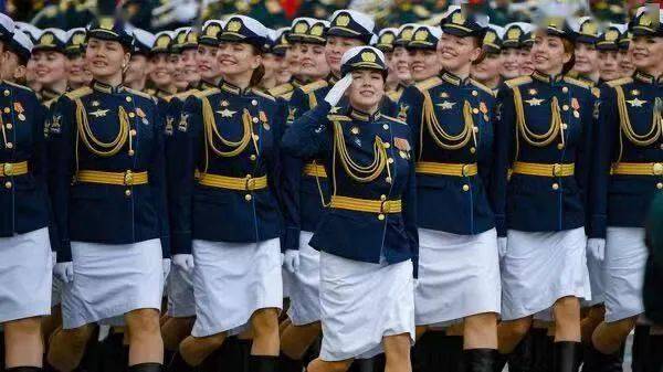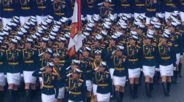 伴随着歌曲《喀秋莎》,女兵列队面带微笑,昂首阔步地走过红场接受检阅。
