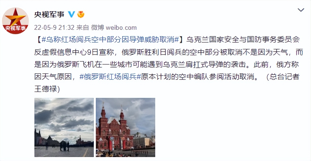 乌克兰国家安全与国防事务委员会反虚假信息中心9日宣称,俄罗斯胜利日阅兵的空中部分被取消不是因为天气,而是因为俄罗斯飞机在一些城市可能遇到乌克兰肩扛式导弹的袭击。此前,俄方称因天气原因,俄罗斯红场阅兵原本计划的空中编队参阅活动取消。(总台记者王德禄)