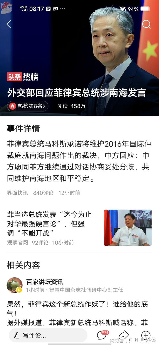 这次菲律宾的新总统虽然说了一些强硬的话,但基本上都是竞选时语言的延续。但总的来说,小马科斯还是主张与中国的和平友谊的。在这里我们还是要观他的言行,看他对中国的态度,看他采取什么样的政策的。且现在也绝对不是和他翻脸的时候,也不是批评他的时候,而是要表现出充分的善意。你们,说呢?