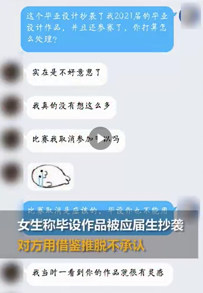 5月26日,湖南长沙。汤女士发文称,自己的毕业设计被一个应届生抄袭并用于参赛。在与其沟通无果后,便尝试与校方取得联系。汤女士称,对方用“灵感”“借鉴”等理由推脱,虽然提出退赛,但始终不承认抄袭。