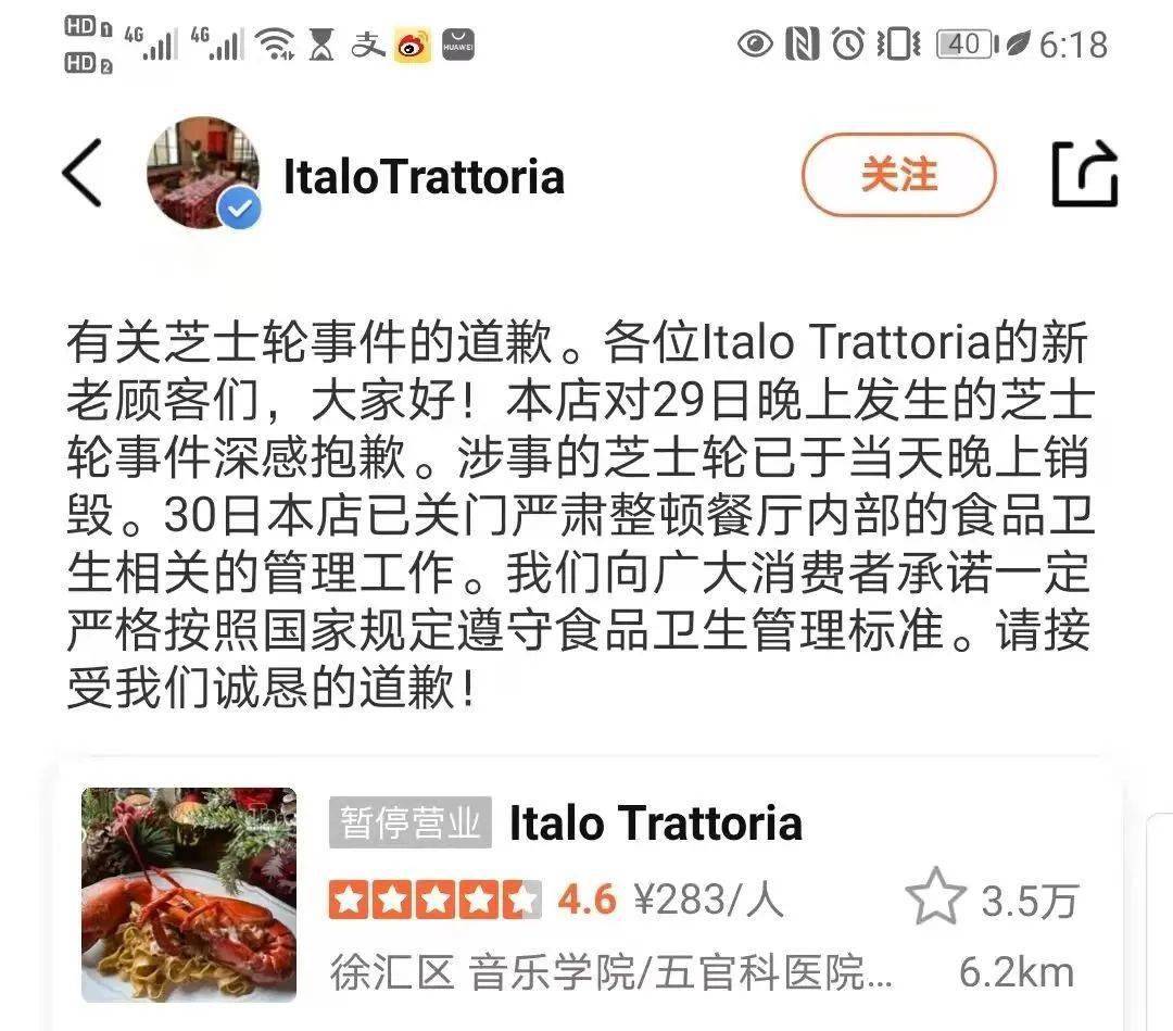目前,大众点评上的页面信息显示, 该餐厅已经“暂停营业”,商家同时在页面发出致歉信,表示已于12月30日关门,严肃整顿餐厅内部的食品卫生相关管理工作。