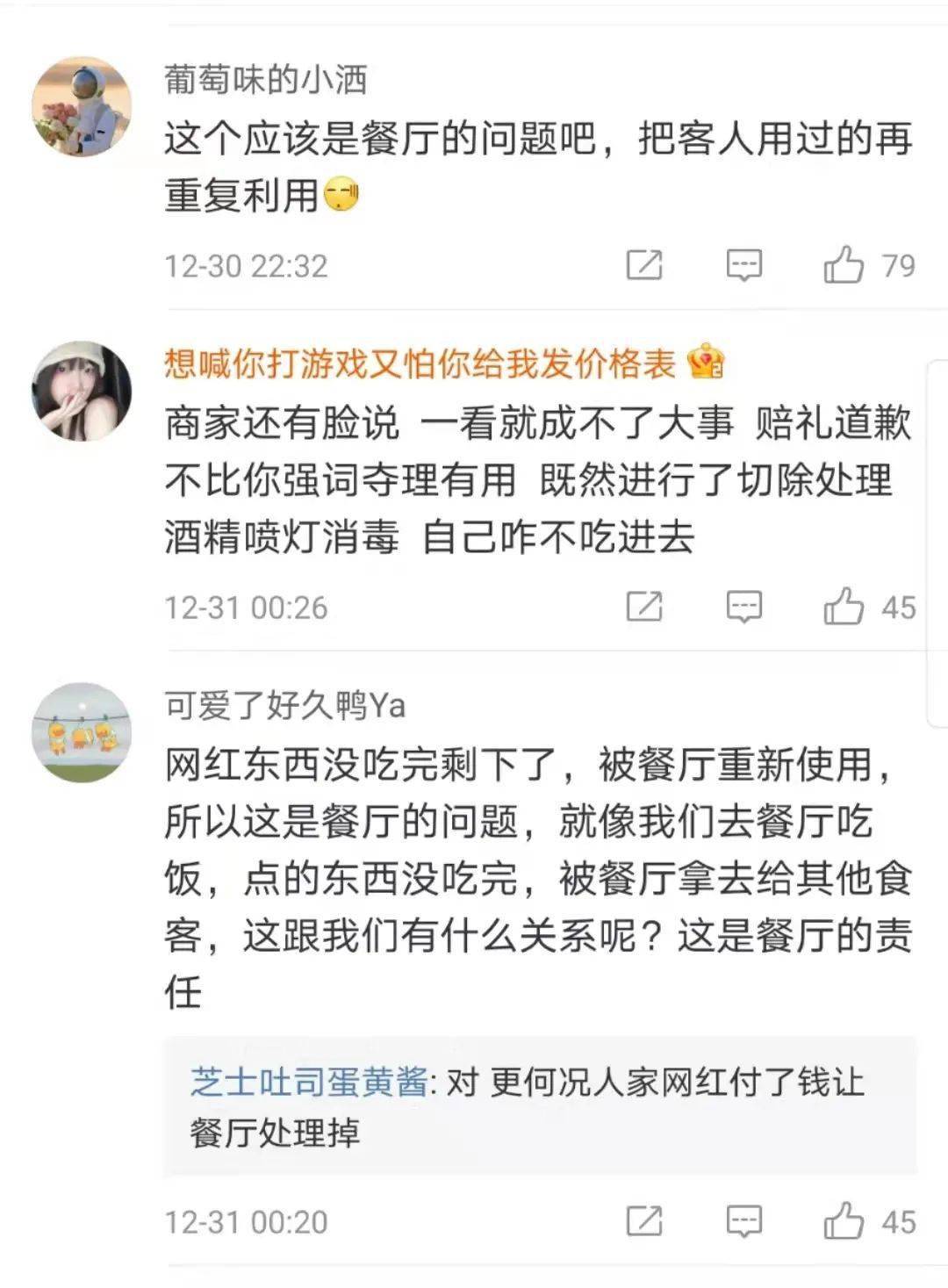 视频中,奶酪盘有了明显的缺口。也正是因为这个缺口,多位冲着白冰推荐去探店的网友发现,被白冰咬过的奶酪盘仍在被使用。即使是粉丝,也没有人愿意吃被别人咬过一口的食材吧,更何况这只奶酪盘作为公共食材被使用了一个多星期。