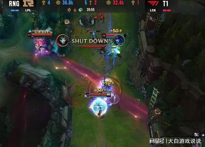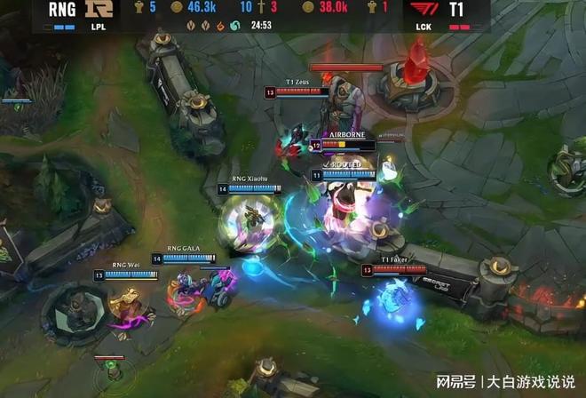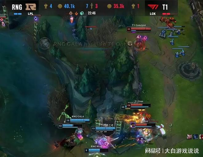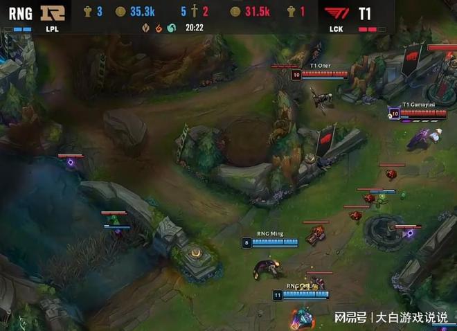 22:46 T1想开小虎,但是小虎大招可以自保。洛开到三个人,小炮跳起来了,T1上中野三人阵亡,随后RNG拿下龙魂。