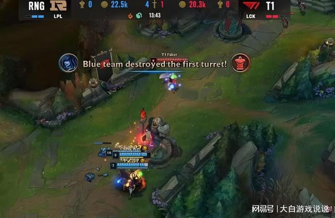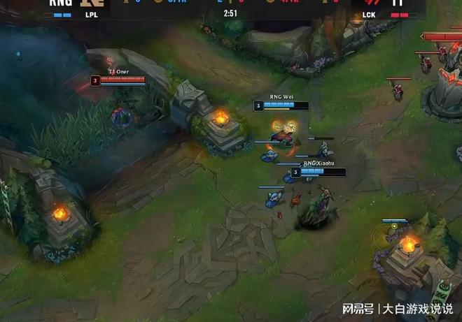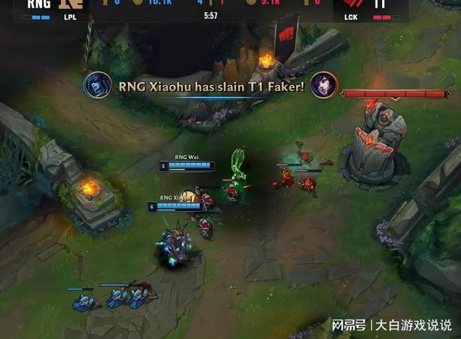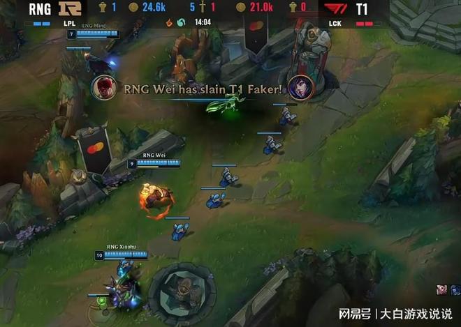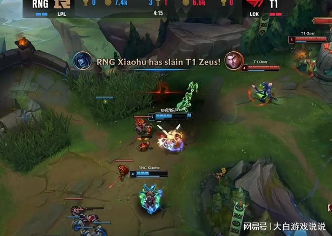 04:15 小虎游走上路,击杀杰斯。RNG前期节奏完美。