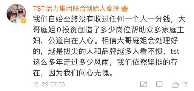 其中一位员工发表长评:“我们自始至终没有收过任何一个人一分钱,大哥庭姐0投资创造了多少岗位帮助众多家庭主妇,公道自在人心。相信大哥庭姐会处理好的,越是拔尖的人和品牌越多人看不惯,tst这么多年走过多少风雨,我们依然坚挺的存在,因为我们问心无愧。”