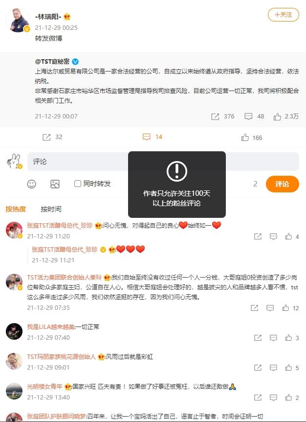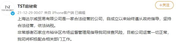 对此,TST庭秘密12月29日凌晨在官方微博回应称,上海达尔威是一家合法经营的公司,自成立以来始终遵从政府指导,坚持合法经营,依法纳税;非常感谢河北石家庄政府指导公司排查风险,目前公司运营一切正常,公司将积极配合相关部门工作。