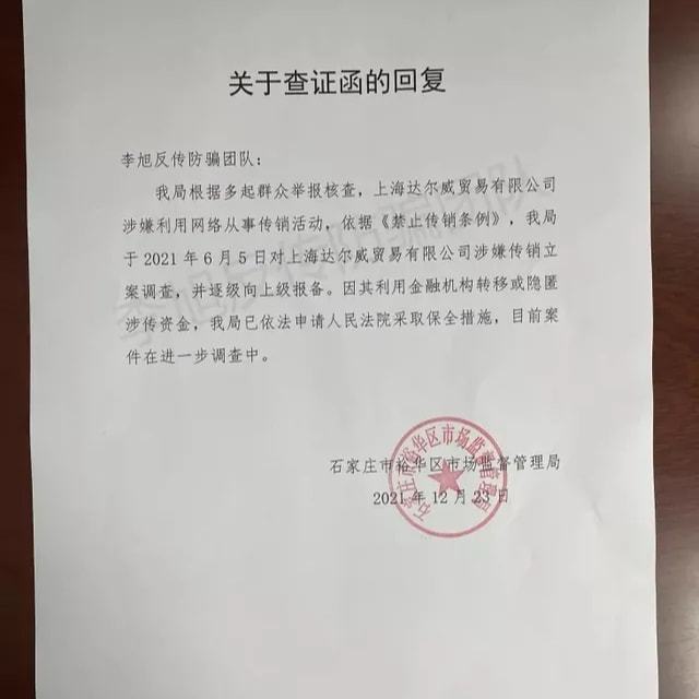 据青海普法报道,石家庄市裕华区市场监督管理局对“李旭反传销团队”《查证函》的回复,该局早在2021年6月5日就已对上海市达尔威贸易有限公司涉嫌传销进行立案调查,并表示“因其利用金融机构转移或隐匿涉传销资金,该局已依法申请人民法院采取保全措施,目前案件在进一步调查中”。