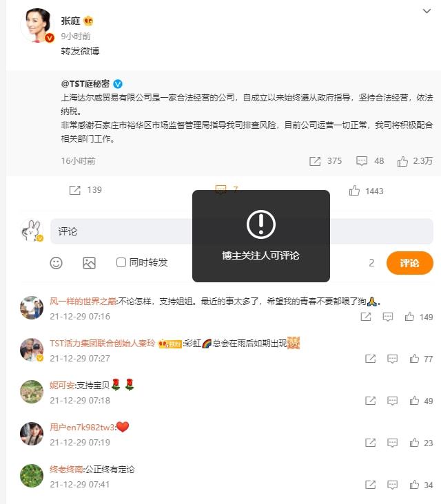 这条微博被张庭、林瑞阳夫妇转发,并且设置了“博主关注的人可评论”,“关注100天以上的粉丝评论”。