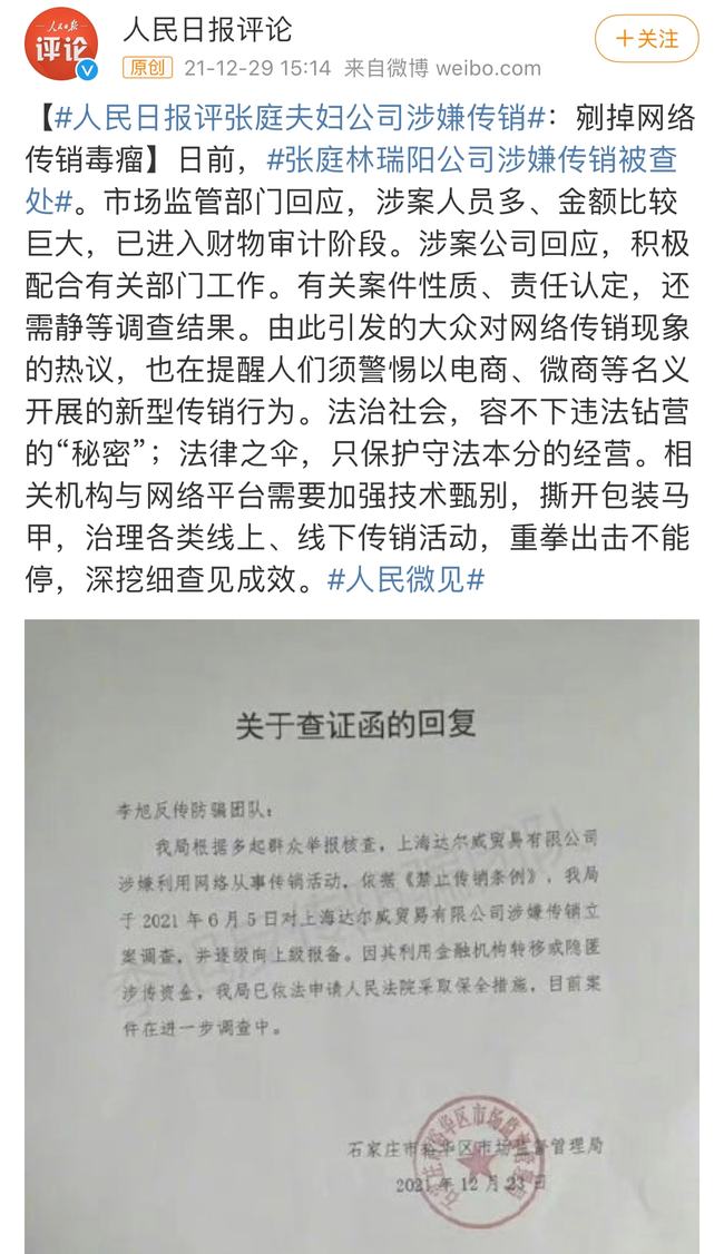 12月29日下午,人民日报发文评“张庭夫妇涉嫌传销”事件:剜掉网络传销毒瘤。