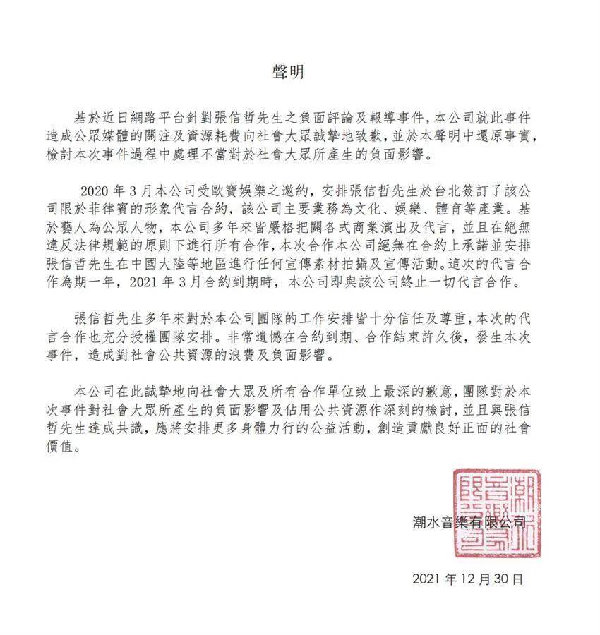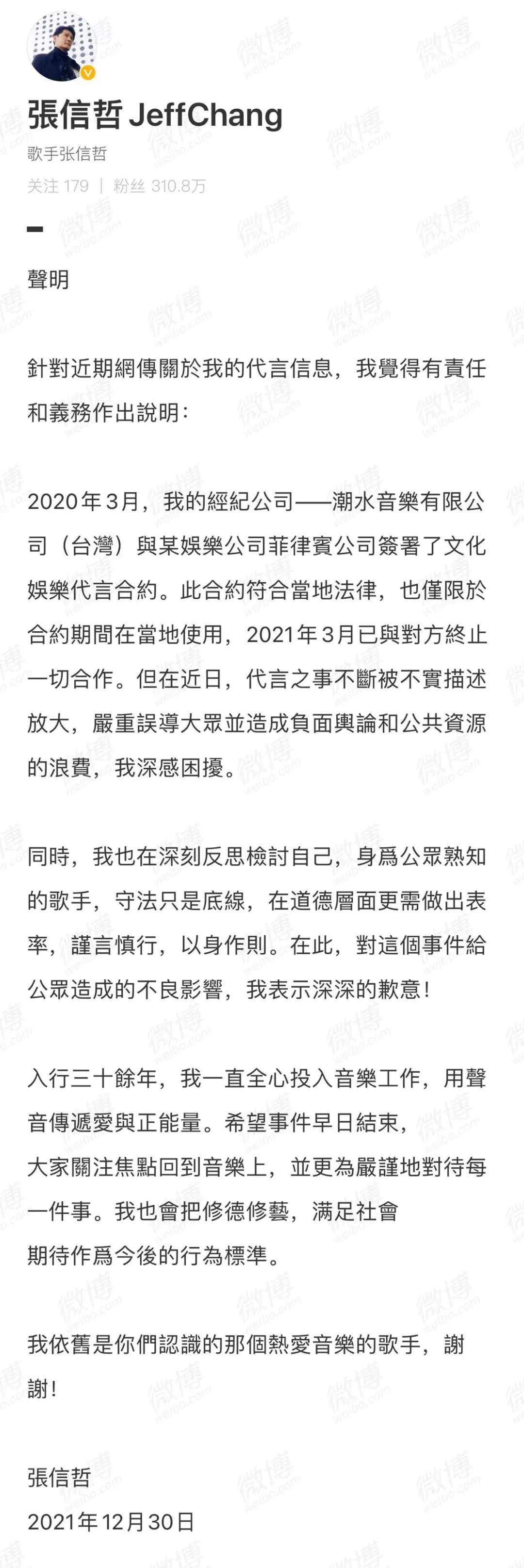 30日18点44分,张信哲本人在微博进行回应。他首先解释了代言合约情况,并对此事造成的不良影响道歉。