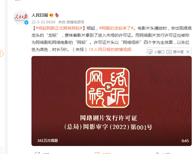明起,网剧的龙标来了。电影片头播放时,会出现绿底龙头的“龙标”,意味着影片拿到了进入市场的许可证。而网络剧片发行许可证也被称为网络剧和网络电影的“网标”。许可证片头以“网络视听”四个字为主体图,以朱红色为底色,时长5秒。(央视)
