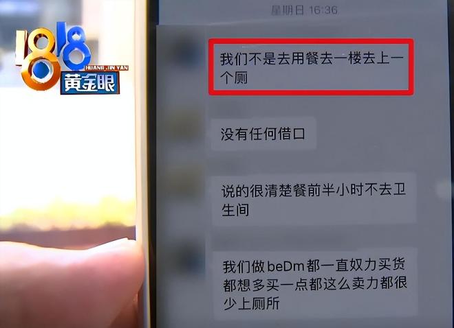 王大姐那位同事回复说,她们不是去用餐,只是去上厕所,工作人员说没有任何借口,说得很清楚,餐前半小时不能去卫生间。