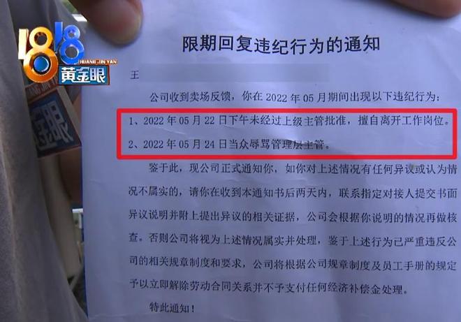 她说忍着不上厕所也难受,但是没办法,最终吃饭的时候上的厕所。5月24日,王大姐收到一份辞职申请表,上面写着“违纪开除,已提前结算5月工资。”她觉得自己并没有犯错,就没有签字。5月25日,她又收到限期回复违纪行为的通知,上面说她出现2次违纪行为,一是擅自离开工作岗位,二是当众辱骂管理层主管。