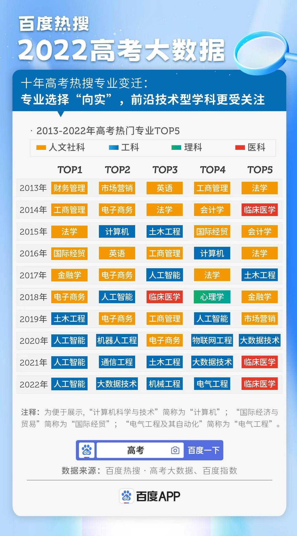 纵观高考热门专业十年变迁,大数据显示,和往年人文社科类专业热度靠前的情况相比,近两年,人工智能、机器人工程、大数据技术等前沿技术型学科已牢牢占据热榜前位。随着全民对公共卫生与健康的关注提升,临床医学专业也在近两年入榜热门专业前五。