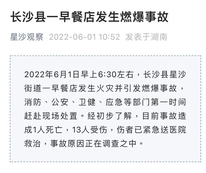 2022年6月1日早上6:30左右,湖南省长沙市长沙县星沙街道一早餐店发生火灾并引发燃爆事故,长沙市消防救援支队接到报警后,立即调派5车、28人赶赴现场处置。