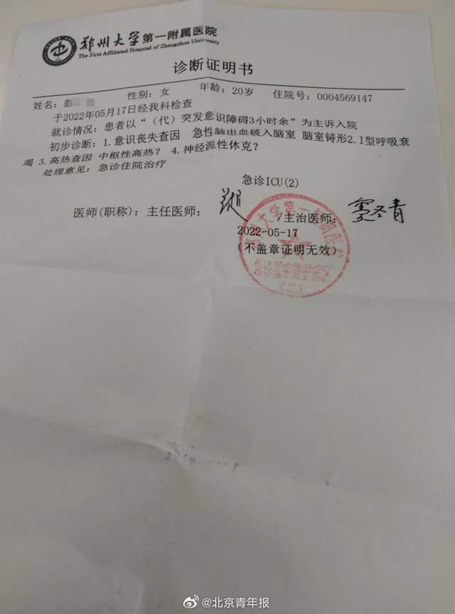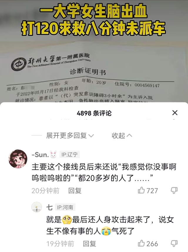 5月30日,河南大学大三女生彭美(化名)去世,去世前,她因脑出血已昏迷14天,一直靠呼吸机维持生命。彭美的父亲彭先生告诉北京青年报记者,女儿5月17日上午在宿舍出现不舒服的情况,曾拨打120求救,但长达近8分钟的通话后,接线员并未派车。