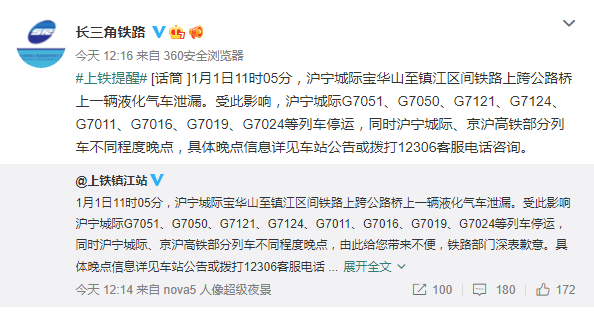 新京报快讯 据中国铁路上海局集团有限公司官方微博消息,1月1日11时05分,沪宁城际宝华山至镇江区间铁路上跨公路桥上一辆液化气车泄漏。受此影响,沪宁城际G7051、G7050、G7121、G7124、G7011、G7016、G7019、G7024等列车停运,同时沪宁城际、京沪高铁部分列车不同程度晚点,具体晚点信息详见车站公告或拨打12306客服电话咨询。