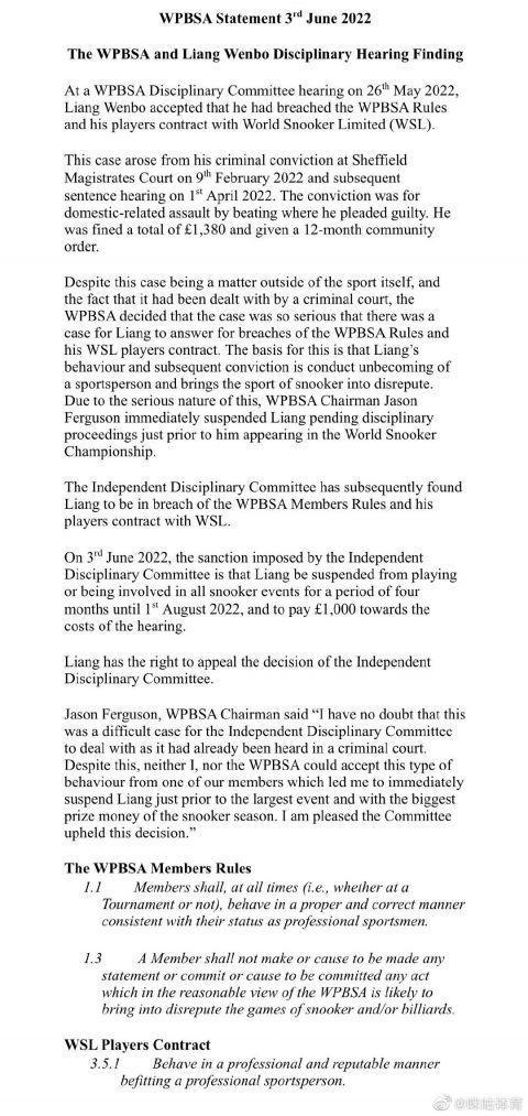 在2022年5月26日举行的世界职业台联(WPBSA)纪律委员会听证会上,梁文博承认他违反了WPBSA会员规则,以及世界斯诺克有限公司(WSL)球员合同。世台联主席杰森·弗格森决定在世锦赛之前对梁文博予以立即停赛等待纪律处分。独立纪律委员会随后认定梁文博违反了WPBSA会员规则以及他的球员与WSL的合同。2022年6月3日,独立纪律委员会实施的制裁是,梁文博将被禁止参加所有斯诺克比赛四个月,直至2022年8月1日止,并支付1,000英镑的听证费用。(咪咕体育)