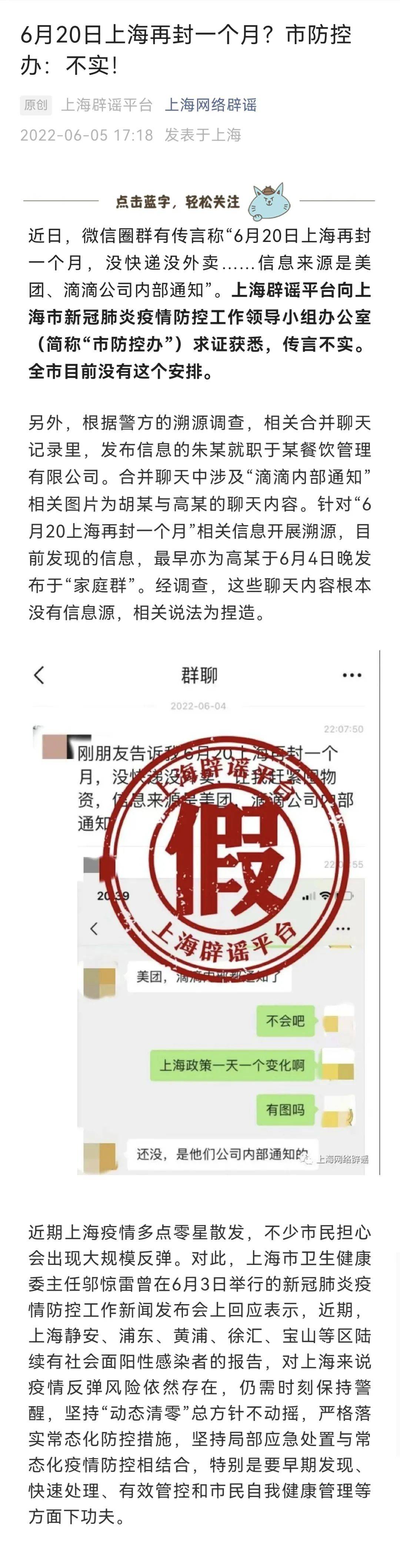 据“上海网络辟谣”消息,近日,微信圈群有传言称“6月20日上海再封一个月,没快递没外卖……信息来源是美团、滴滴公司内部通知”。上海辟谣平台向上海市新冠肺炎疫情防控工作领导小组办公室(简称“市防控办”)求证获悉,传言不实。全市目前没有这个安排。