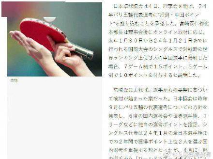 日本乒乓球协会出台新规定,只要能够赢中国排名前三的选手,那么巴黎奥运会国内积分选拔榜将会有额外的加分,7局4胜单打赢了加15分,5局3胜比赛赢了给10分。(@人民日报体育)