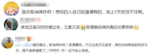 部分网友表示,“想玩的人自己知道请假的,连上7天班顶不住啊”;还有网友结合实际,认为“疫情期间,哪儿也不能去”,建议取消调休。
