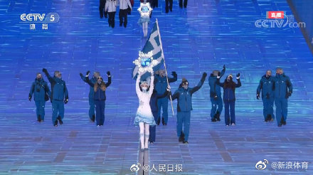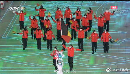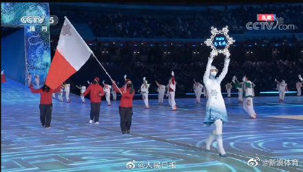 【#代表团的牌子是雪花中国结#】引导员手持的各参赛国家地区名引导牌,采用发光的雪花造型,设计灵感来自“中国结”的图案,寓意团结吉祥!#北京冬奥会开幕式#