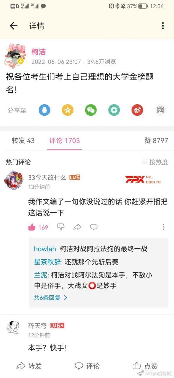 而就在高考前一晚,柯洁还在自己的社交媒体祝福广大考生金榜题名。
