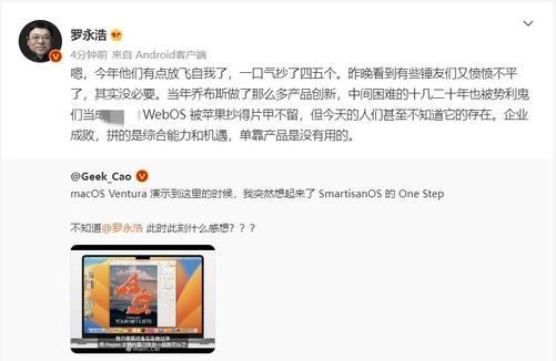 中关村在线消息:今天凌晨,苹果召开WWDC 2022全球开发者大会,重磅更新iOS 16/iPad OS 16/MacOS操作系统在本次大会中登场。今天上午原锤子科技CEO罗永浩怒喷苹果抄袭,声称苹果放飞自我,一口气抄了四五个。