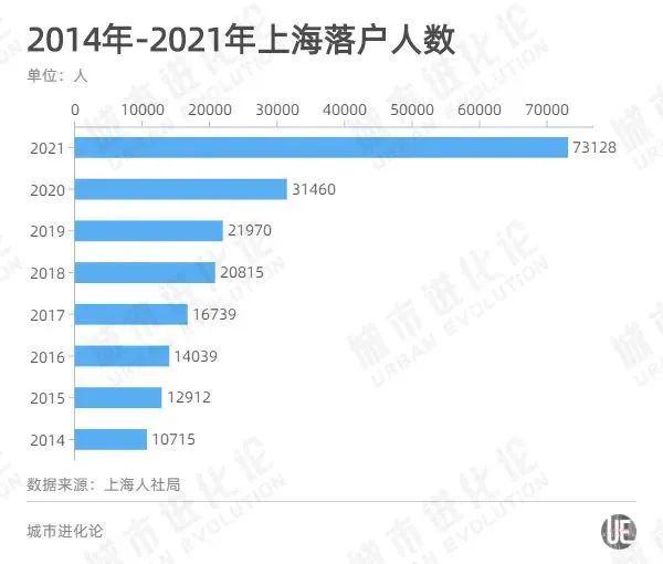2021年,上海落户人数直接在2020年31460人的基础上翻番,总数高达73128人。其中,通过人才引进落户的数量,更是较2020年激增171%,约为2017年至2020年几年人数的总和。