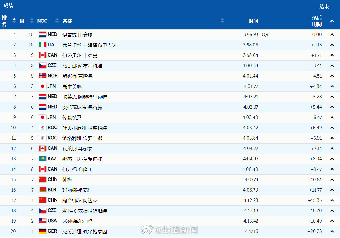 聚焦北京冬奥# 【祝贺!#荷兰选手速度滑冰女子3000米夺金# [金牌]】#荷兰女将破奥运会纪录夺金# 2月5日下午,北京冬奥会速度滑冰女子3000米决赛在国家速滑馆“冰丝带”进行,荷兰名将伊蕾妮·斯考滕发挥出色,以3分56秒93的成绩夺得冠军,同时打破了尘封20年的奥运会纪录。两名参赛的中国选手韩梅和阿合娜尔·阿达克分别夺得第15位和第17位。(北京日报)#速度滑冰女子3000米#