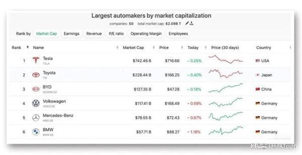 目前,特斯拉依然是稳坐第一宝座,以7424.6亿美元市值遥遥领先,市值大约是比亚迪的6倍。