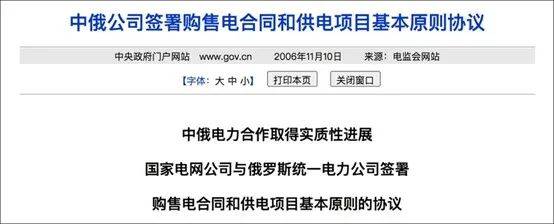 2012年,中国国家电网公司同俄罗斯电力进出口垄断运营商国际统一电力系统集团(Inter RAO)的全资子公司——俄罗斯东方能源股份公司签署了长达25年的购电协议,协议约定,到2037年前,俄罗斯将向中国供应1000亿千瓦时电量。