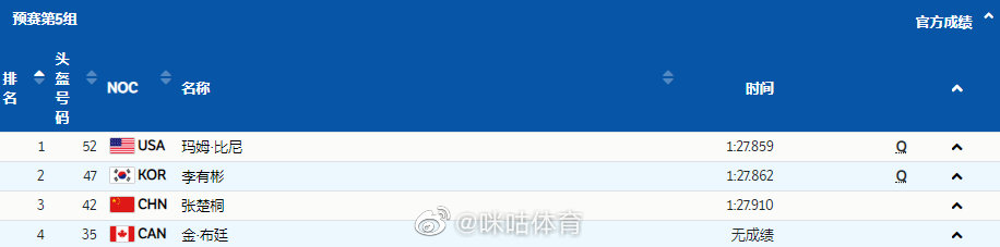张楚桐@桐楚张 1分27秒910,位居4个最快的第3名晋级